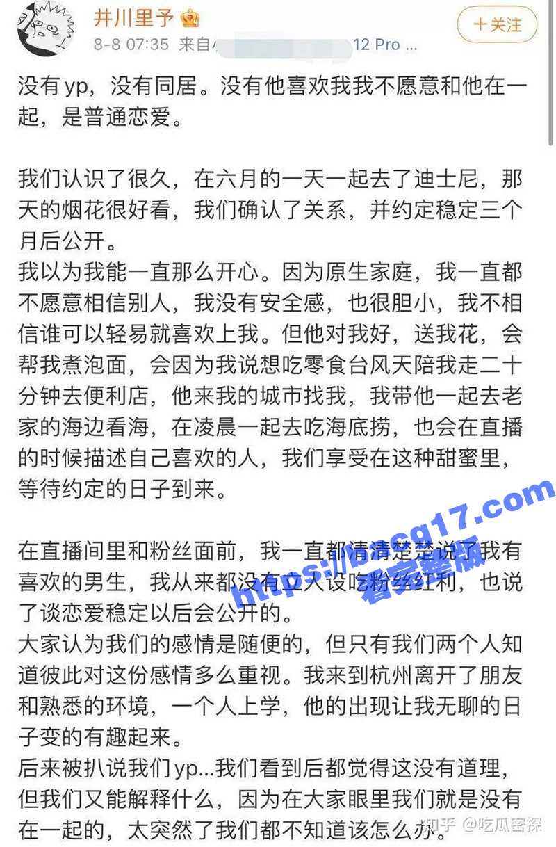 如此开放的恋爱观,也让这样一位清纯的网红美女备受争议,网友甚至纷纷质疑两人是py关系。这样不堪的词语对一个公众人物的形象而言,无疑是巨大的伤害。不堪困扰,“井川里予”终于发长文回应争议。